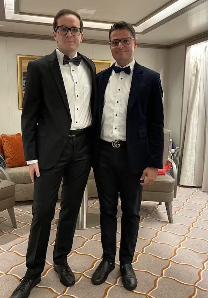 Formal optional nights on Silver Nova mean you can dress up, as Johannes and Orkan Baerenfaenger show here, or go with a less formal look, on those nights, men must wear jackets in any indoor space./Silversea